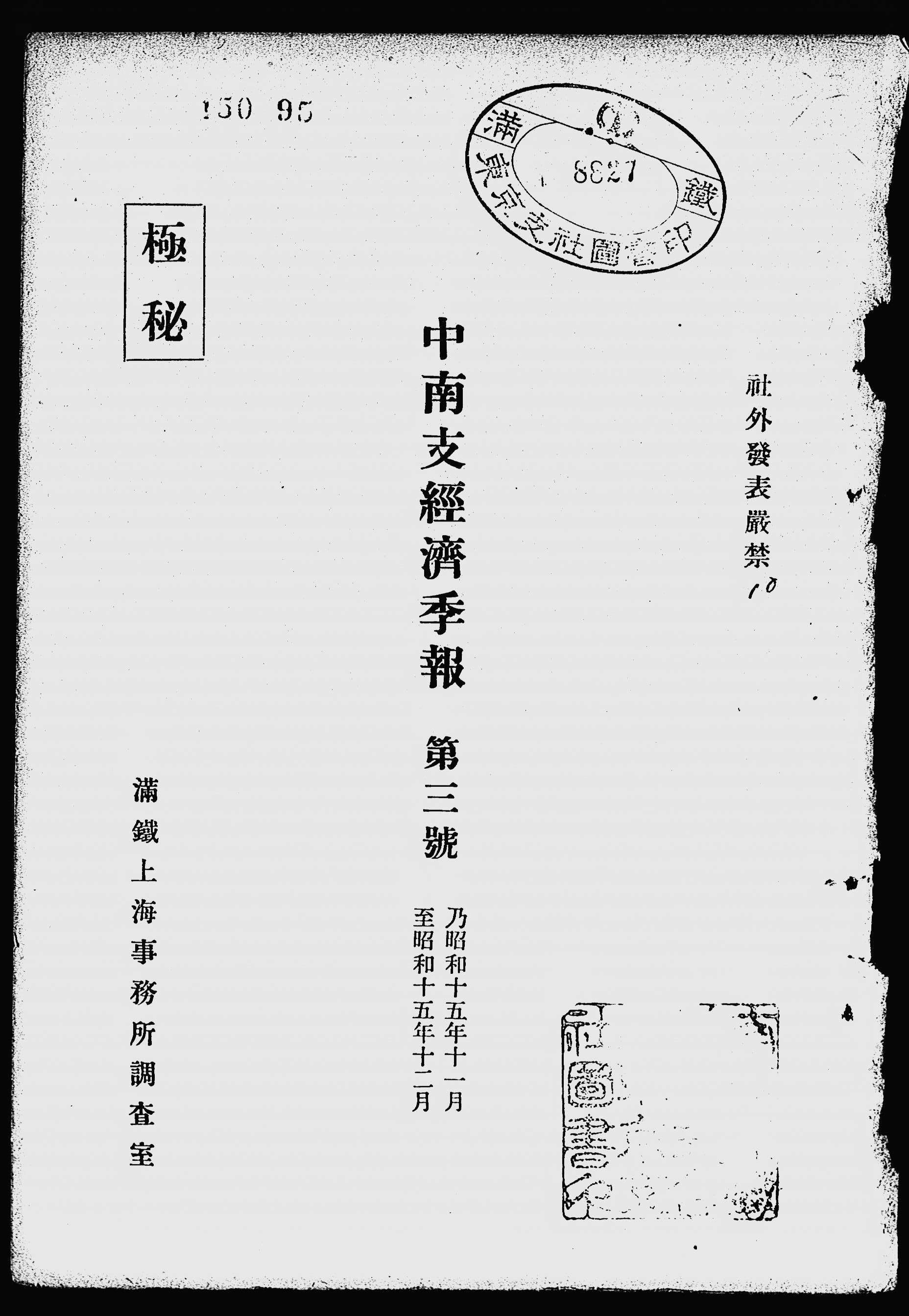 中南支經濟季報. -- 通巻2號(昭15.7/10)-通巻5號(昭16). -- 南滿洲鐵道株式會社上海事務所調査室, 1940. k.